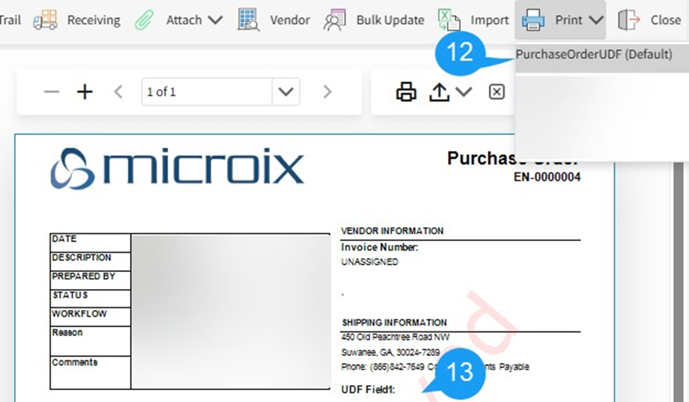 Preview or print the document and verify that the newly added field (such as the UDF label/value) appears in the correct location on the output.
