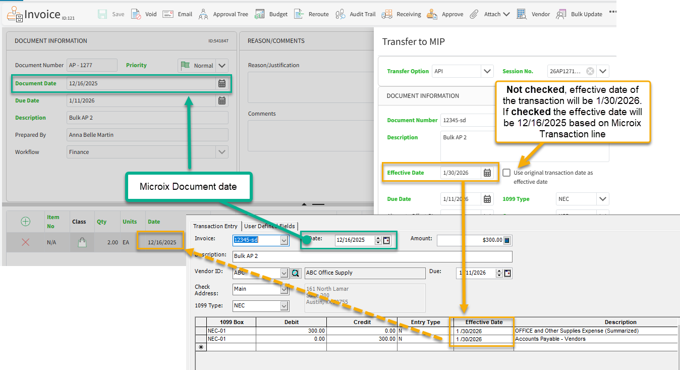 This article explains how the Document Date and the Transaction Effective Date are determined when transferring a document from Microix to MIP Accounting, with specific focus on the “Use Original Transaction Date as the Effective Date” option in the Transfer dialog.