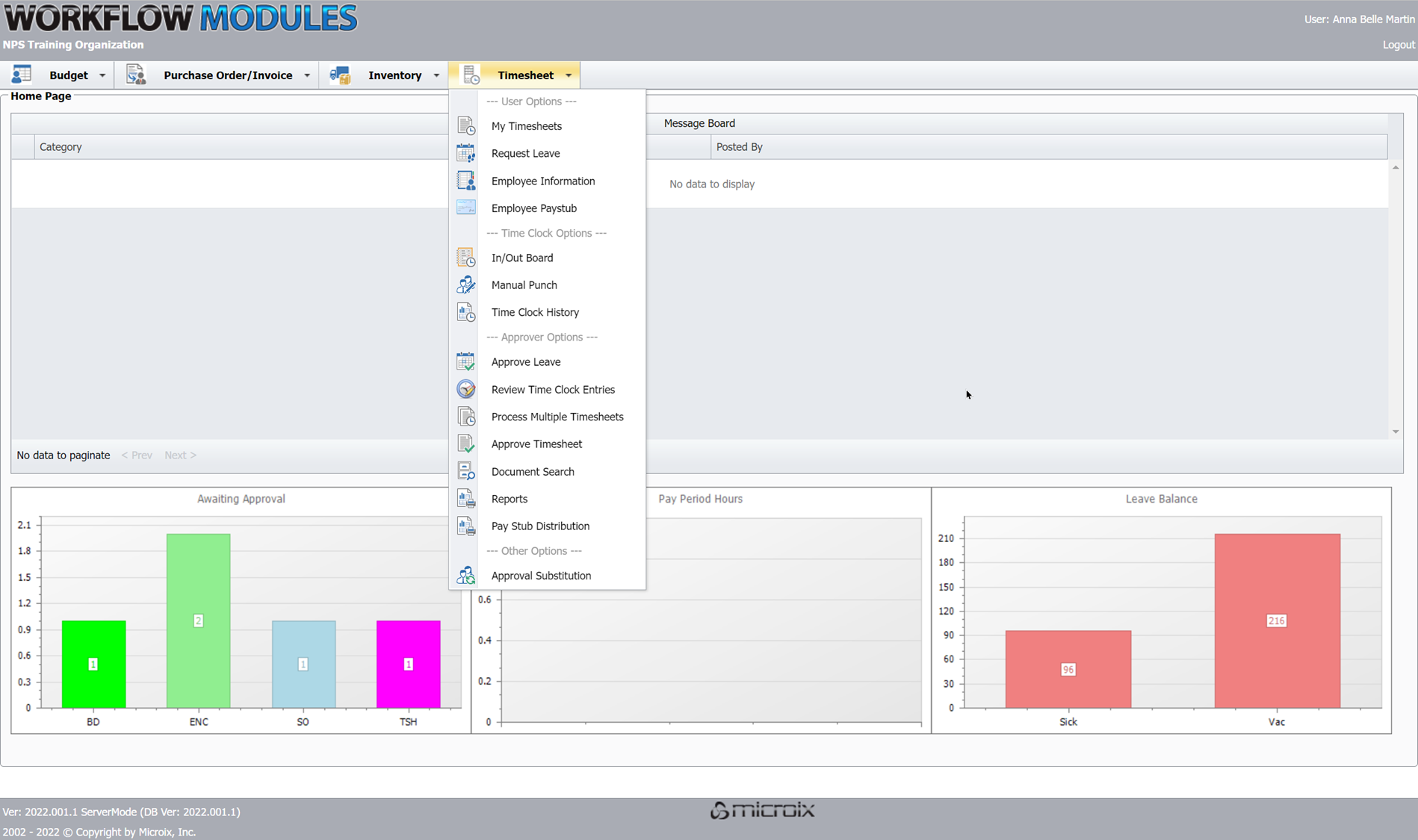Microix Cloud Companion Web Application -Timesheet Module Main Menu Options