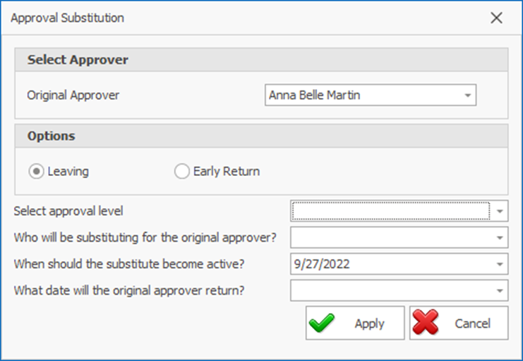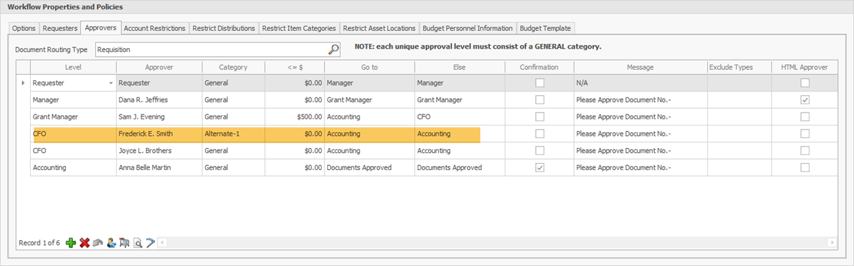 Alternate approvers (permanent solution) are setup in the workflows and can approve anytime they are required to do so. Alternate approvers can receive email notification as well. Can have up to 5 alternate approvers per level.
