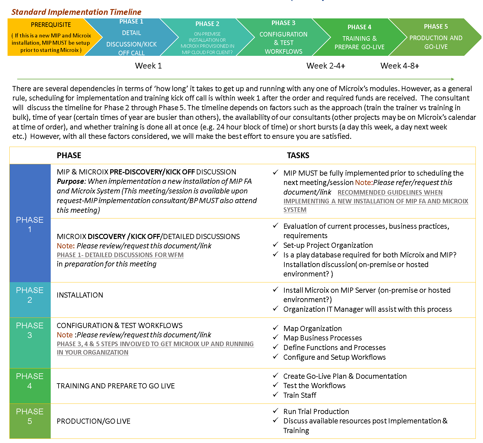 Here is a brief description of what to expect for a FULL implementation and training (Phases 1-5). You can also click on the following link for detailed information: Microix Sales - Standard Implementation and Training Process for Microix Workflow Modules (WFM) - Knowledge base.  This information will also be provided to the client in the introduction email.