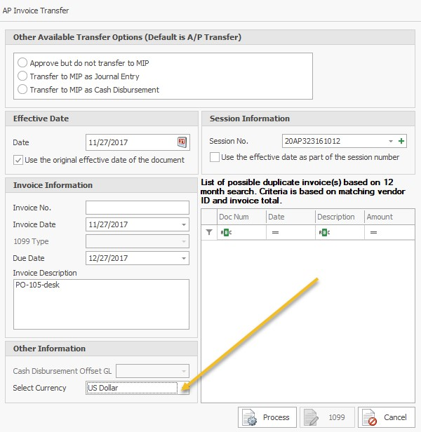 invoice transfer dialog box. Users creating the PO in Microix will enter the