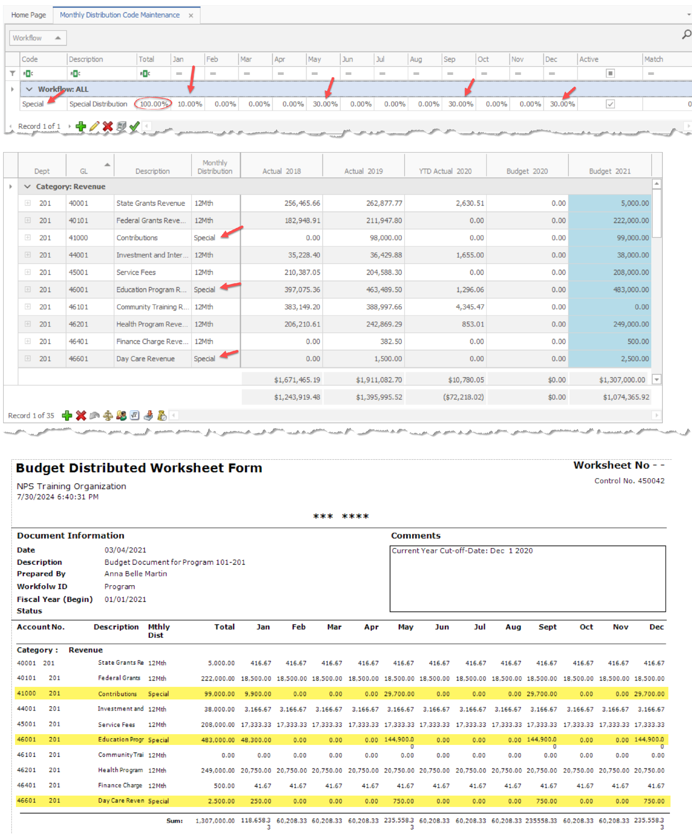 A: If you have the monthly % spread for the annual budget from last year, you can create a custom spread (Monthly Distribution) in Microix (Special) and apply it to a specific budget line item (or the entire budget worksheet), as shown below.