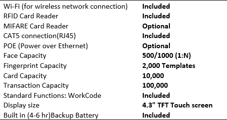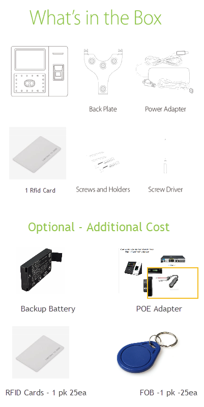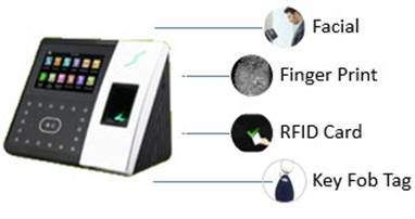 Can enroll staff using Facial, Fingerprint, *RFID Card or *Key Fob Tag