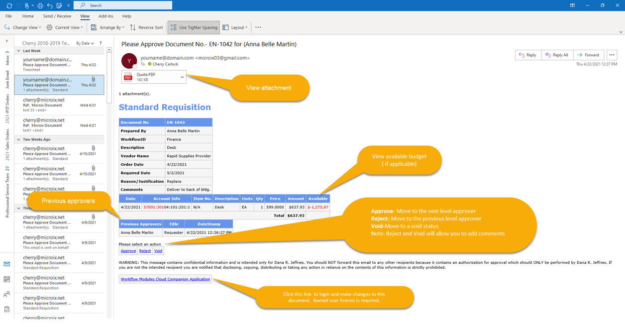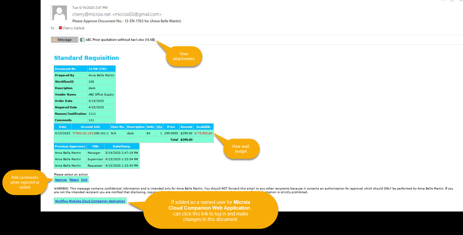 It enables certain level approvers to conveniently approve directly from their email using their smartphone, tablet or personal computer. The HTML Approval feature facilitates the manager’s ability to review and take approval actions without having to log into the software.